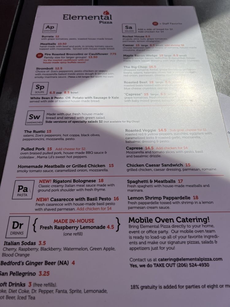 At Elemental Pizza, located in the heart of Seattle's University Village, we embrace the art of pizza-making with a vibrant twist. Our story is rooted in passion and quality, offering a delightful array of Italian fare, from handcrafted pizzas to savory appetizers like our burrata and artisanal meatballs. Our casual, family-friendly atmosphere, complete with outdoor seating and happy hour specials, welcomes everyone. Diners rave about our flavorful crusts and generous toppings, making each bite a memorable experience. Whether you’re stopping by for lunch post-shopping or enjoying a dinner with friends, Elemental Pizza promises a fulfilling and satisfying culinary journey.